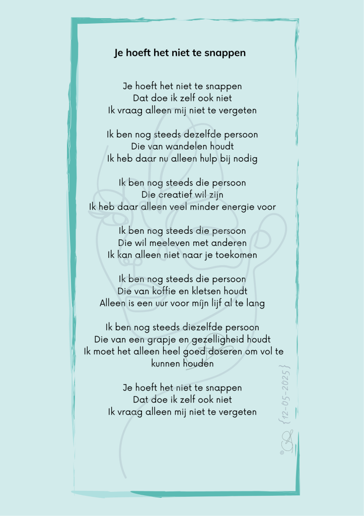 Het voelt voor mij fijn om in mijn schrijfsels (of dat nu een Krabbel, gedicht of iets anders is) de emoties die ik zelf ervaar, of die ik uit contact met anderen oppik, te kunnen uiten. Soms is dat iets verdrietigs, regelmatig probeer ik het met enige humor te benaderen. Als iemand zich er in herkent en er steun uit haalt, dan is mijn opzet geslaagd. 🍀LikeLike
