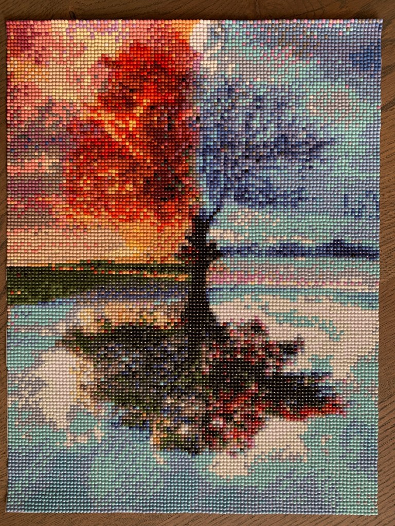 Vorige week heb ik, na tweeënhalf jaar, een diamond painting afgemaakt die ik in 2023 voor mijn 50e verjaardag van een goede vriendin had gekregen. Afmetingen ongeveer A3 formaat. Het is een prachtige afbeelding van een boom verdeeld in de vier seizoenen. En ik ben blij dat het me gelukt is om hem zelf helemaal af te maken.